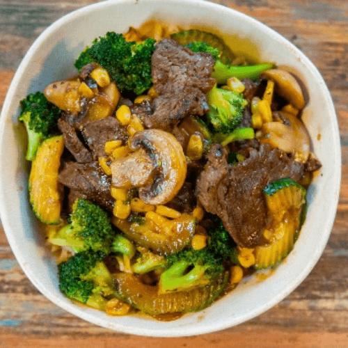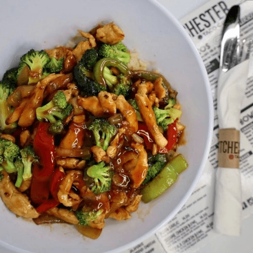 Chicken, brown rice, broccoli, peppers, onions, and teriyaki sauce