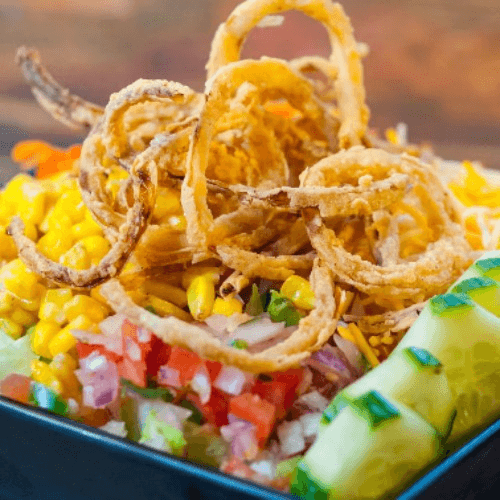 Romaine lettuce, shredded carrots, cucumbers, Tex-Mex cheese, corn, fried onions, and pico de gallo, served with chipotle ranch