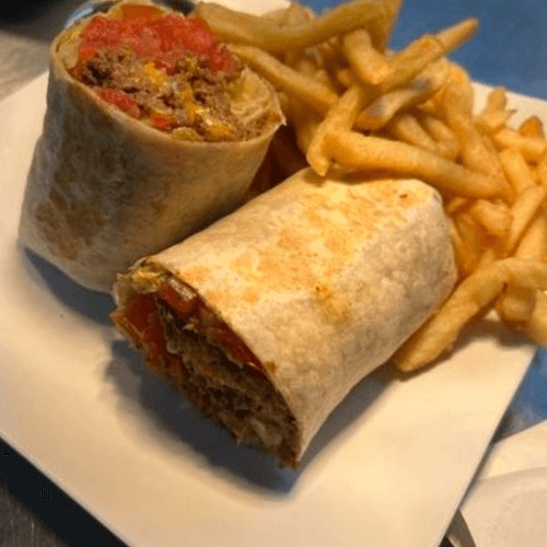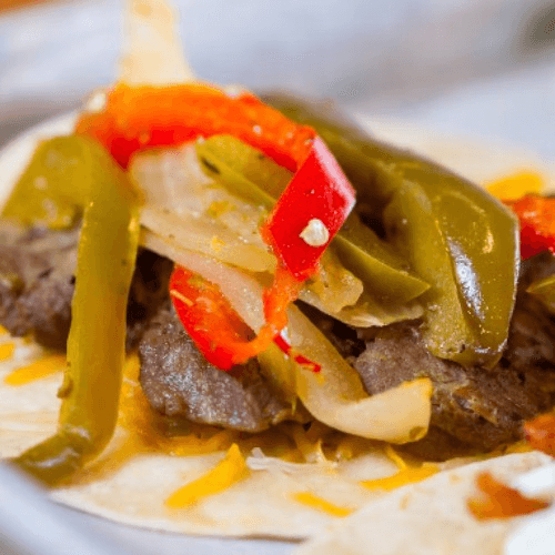 Steak, sautéed peppers, onions, and Tex-Mex cheese served on a soft flour tortilla