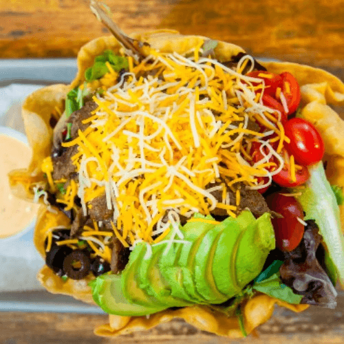 Steak, spring mix, avocado, tomatoes, corn, black olives, Tex-Mex cheese, and spiced blue cheese dressing served in our house-made taco shell