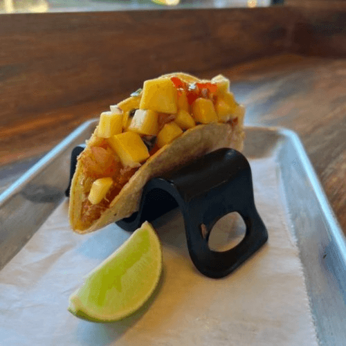 spiced shredded pork, pepper jack cheese topped with mango salsa sweet chili and a spicy red pepper drizzle on a corn tortilla