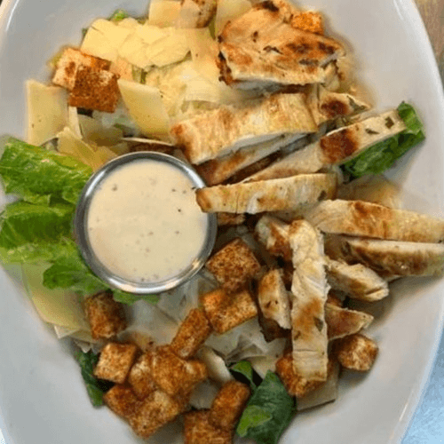 Grilled chicken, house-made croutons, romaine lettuce, and Parmesan cheese served with Caesar dressing