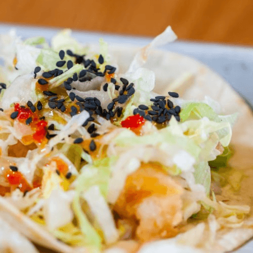 Battered shrimp topped with a sweet chili sauce, lettuce, and black sesame seeds served on a soft flour tortilla