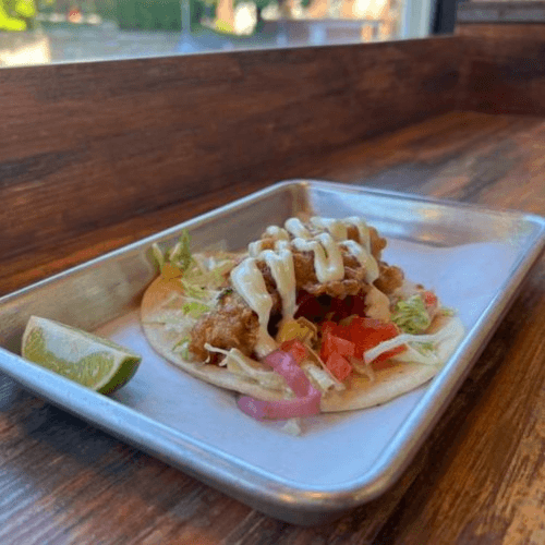 Battered fish, lettuce, tomatoes, pickled red onions, and avocado wasabi served on a soft flour tortilla
