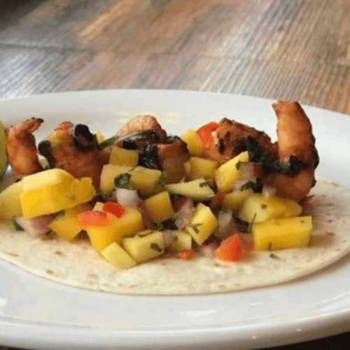 Chipotle marinated shrimp topped with mango salsa and a light sweet chili sauce served on a soft flour tortilla