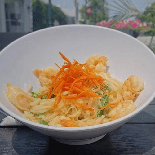 Shrimp, rice noodles, and carrots with a white wine butter sauce