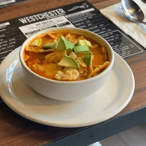 Mexican-style tortilla soup with shredded chicken, cilantro, corn, avocado, Pepper Jack cheese, and crispy tortillas