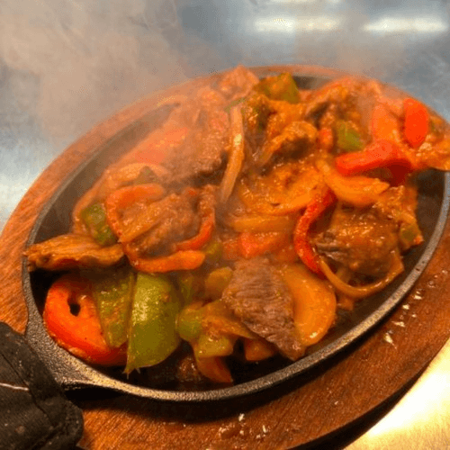 Sliced NY strip steak with peppers, onions, Tex-Mex cheese & tomatoes served with sour cream, guacamole & tortillas