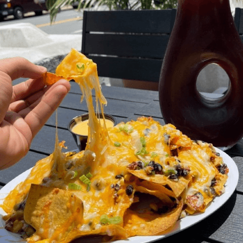 Chorizo, black beans, corn, jalapeños, Tex-Mex cheese, cilantro, and queso fresco served with cheese sauce