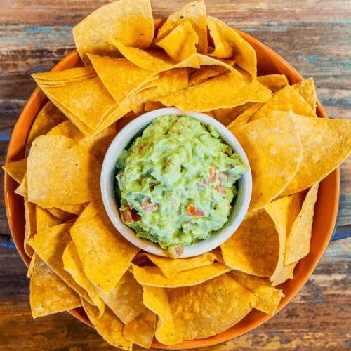 Homemade guacamole served with corn tortilla chips