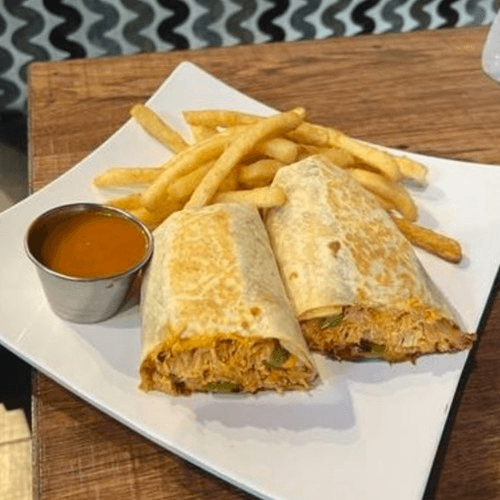 Buffalo fried chicken with Tex-Mex cheese, and lettuce, topped with ranch served on a soft flour tortilla