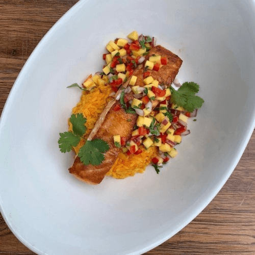 Grilled salmon topped with fresh mango salsa over yellow rice
