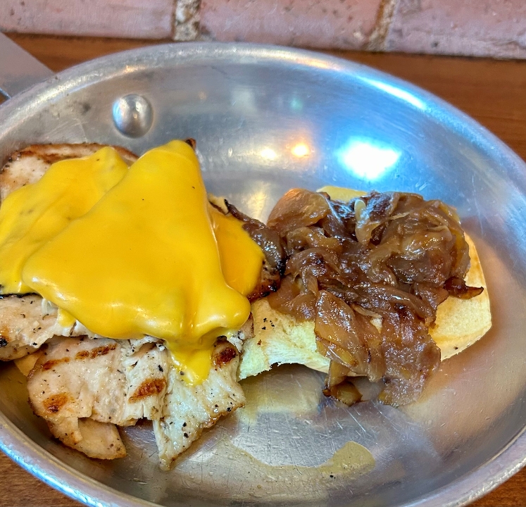 American cheese lots of sweet onions cooked low & slow served on Martin's potato roll