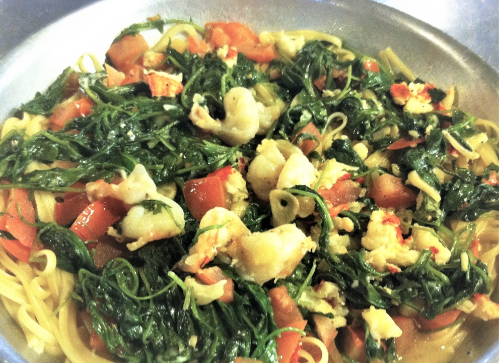 Lobster tail & Shrimp sauteed in a garlic-butter sauce, arugula & fresh tomatoes, over imported linguine