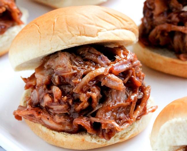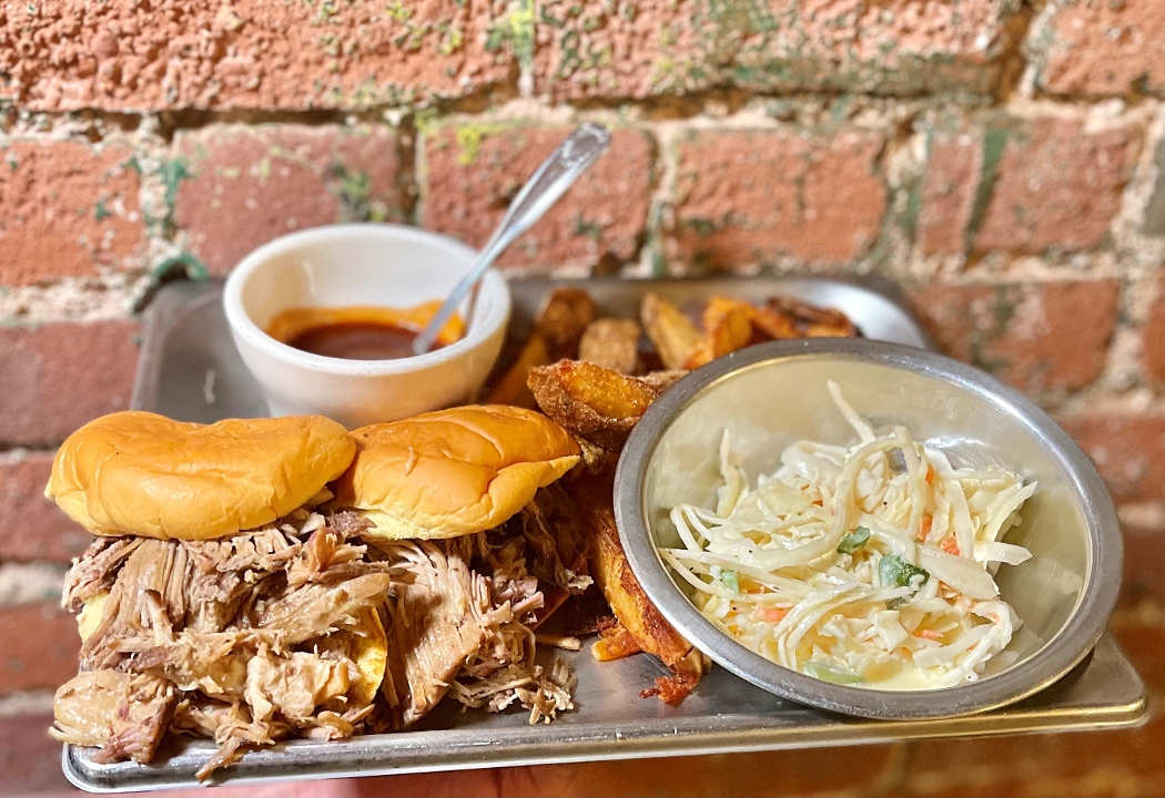 in-house smoked pulled pork, BBQ sauce on a Martin potato roll
