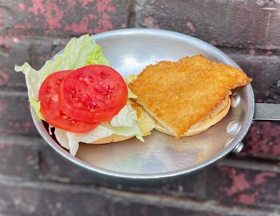 Tender chicken cutlet panko breaded and fried crispy served with lettuce and tomato on Martin potato roll