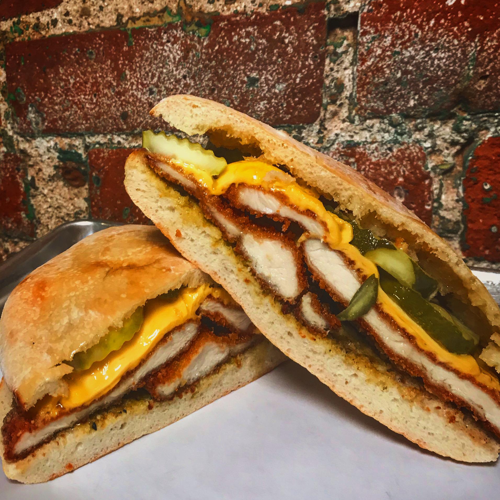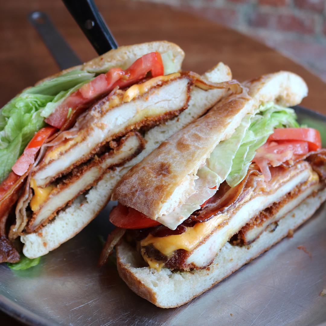 panko chicken, American cheese, lettuce, tomato, bacon, chipotle sauce on our homemade artisan roll