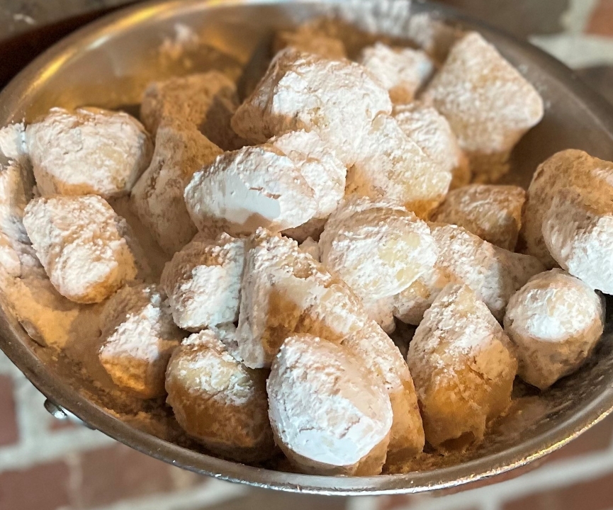 Golden, fried pizza dough tossed in powdered sugar and served warm