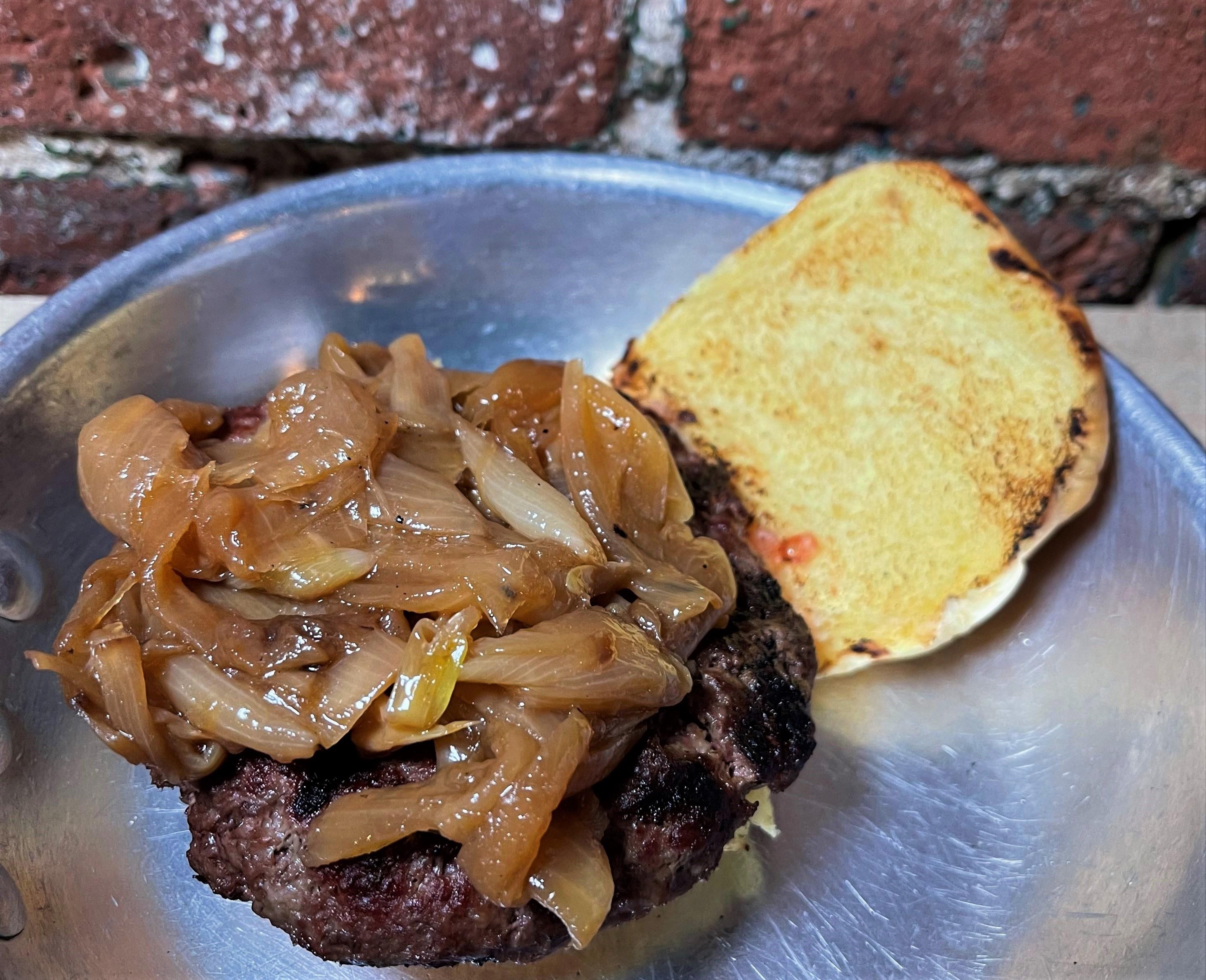 Our special blend of fresh beef char-grilled to order topped wit slow cooked caramelized onions on a Martin's potato roll