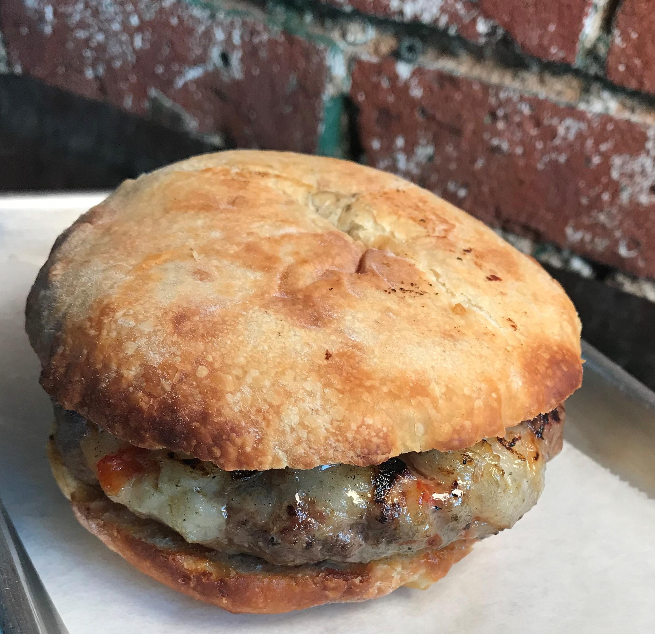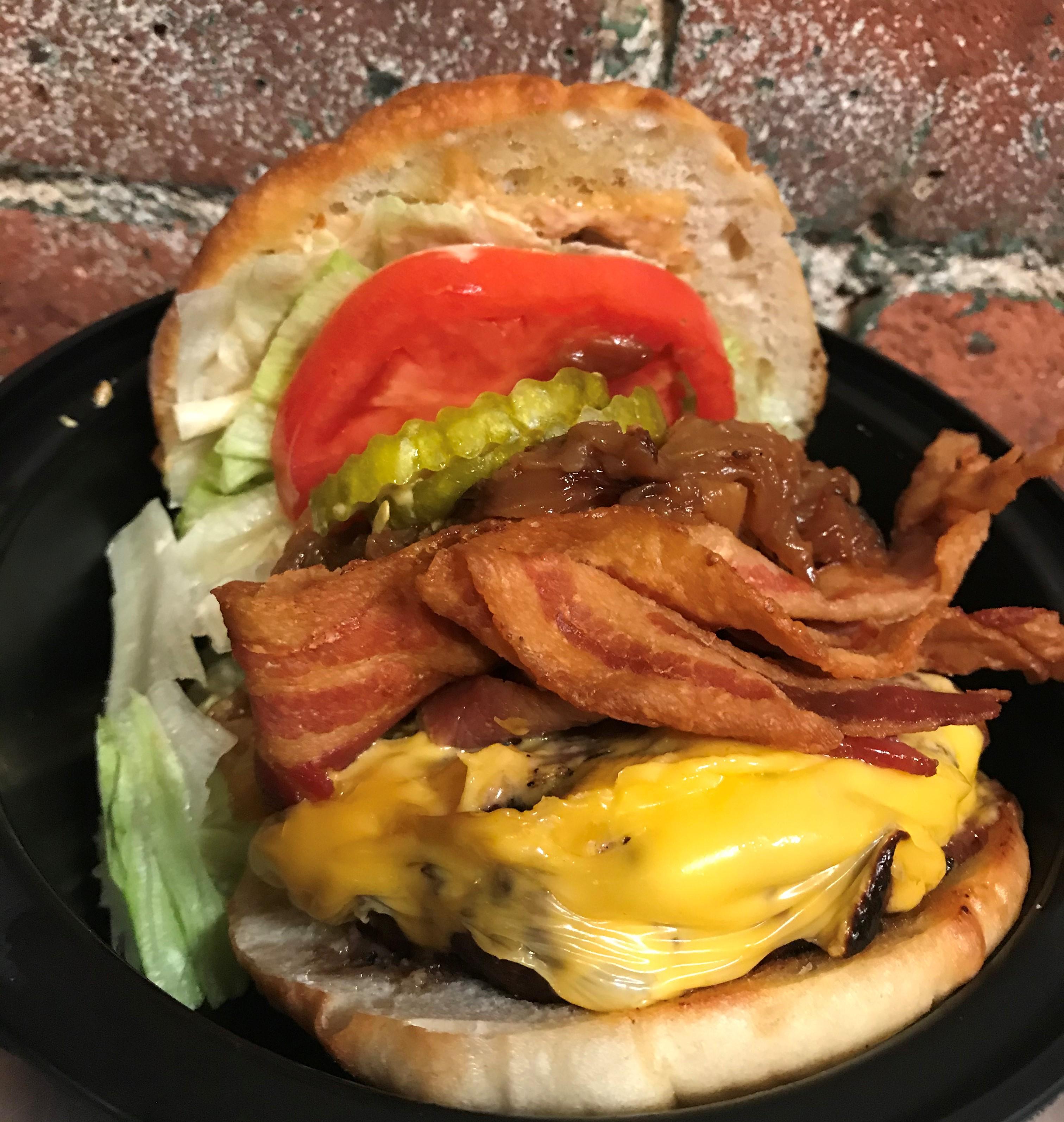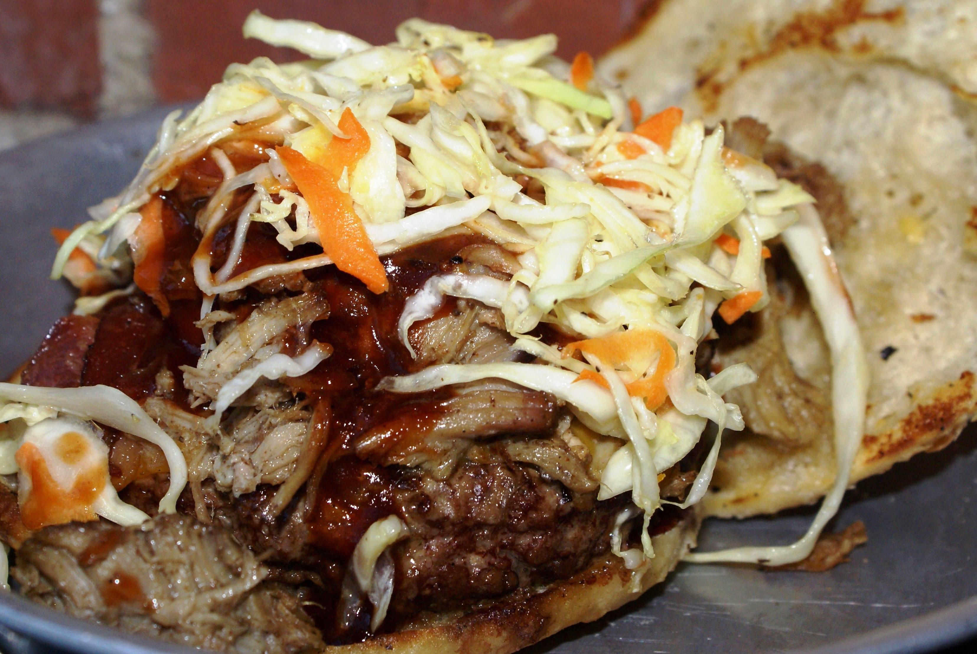 Bacon cheddar cheeseburger topped with pulled pork, BBQ sauce and mom's cole slaw served on our homemade artisan garlic roll