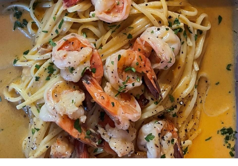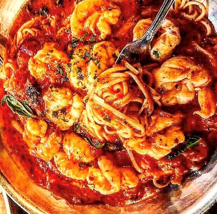 SHRIMP! 🦐 🦐 Take-Out Only! Tender sweet shrimp sautéed in EVOO, garlic, wine and marinara sauce served over linguine.