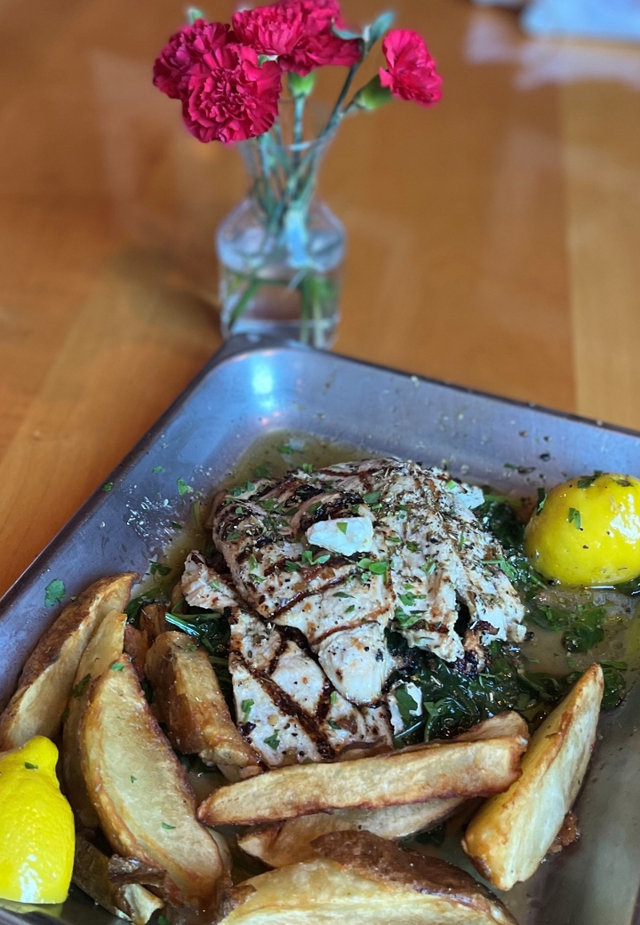 Tender char-grilled chicken cutlets on a bed os sauteed romaine extra virgin olive oil garlic, feta, lemon and oregano served with potatoes