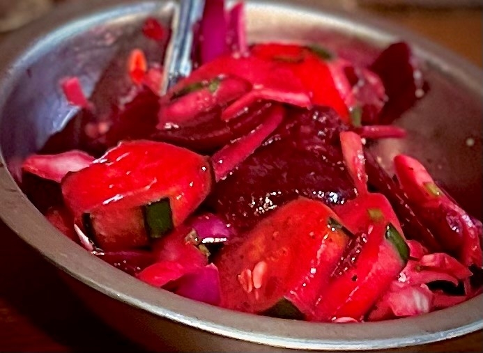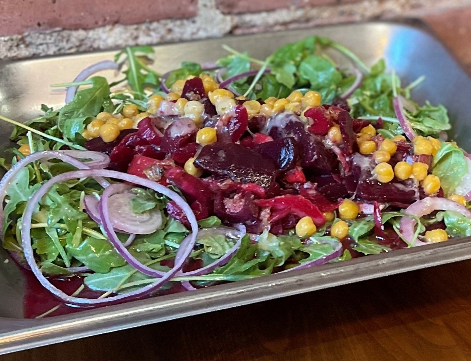 Sliced beets, arugula, chick peas, cucumbers, red onion, honey lemon dressing