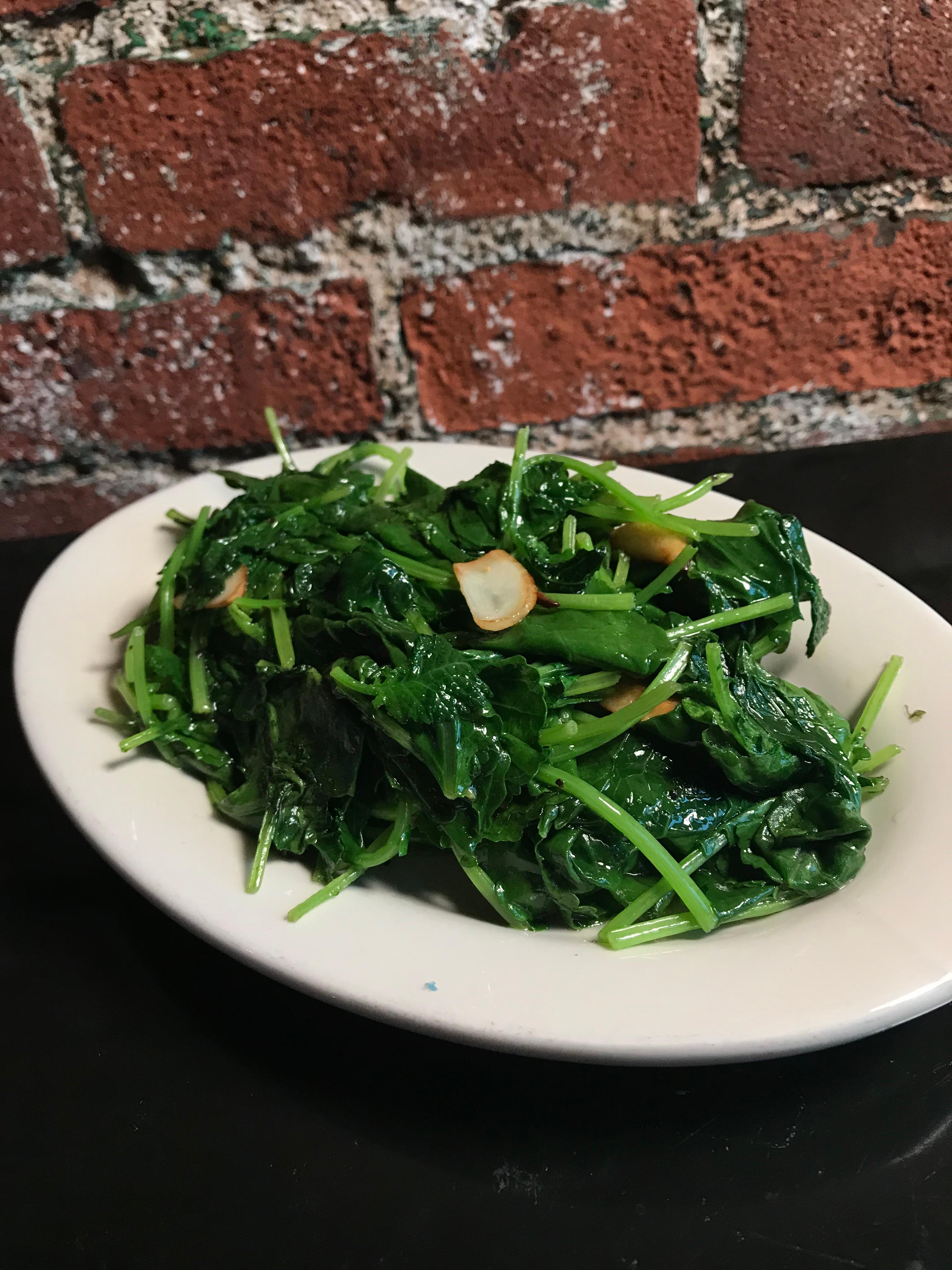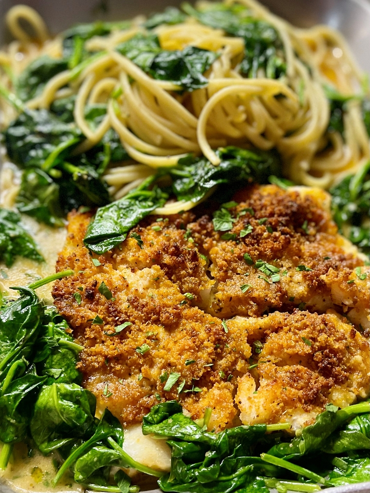 Faroe Isalnd Salmon baked with our blend of oreganata bread crumbs In a butter wine sauce with spinach sauteed in garlic and extra virgin olive oil served over imported linguine