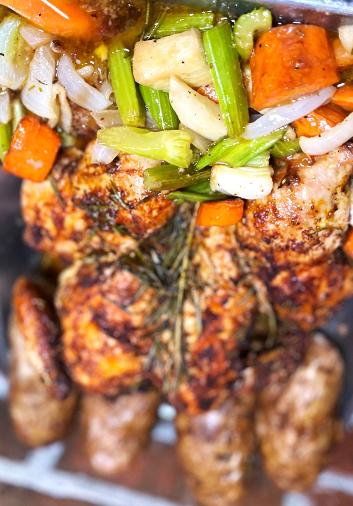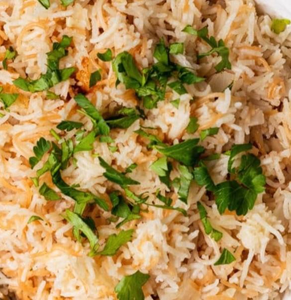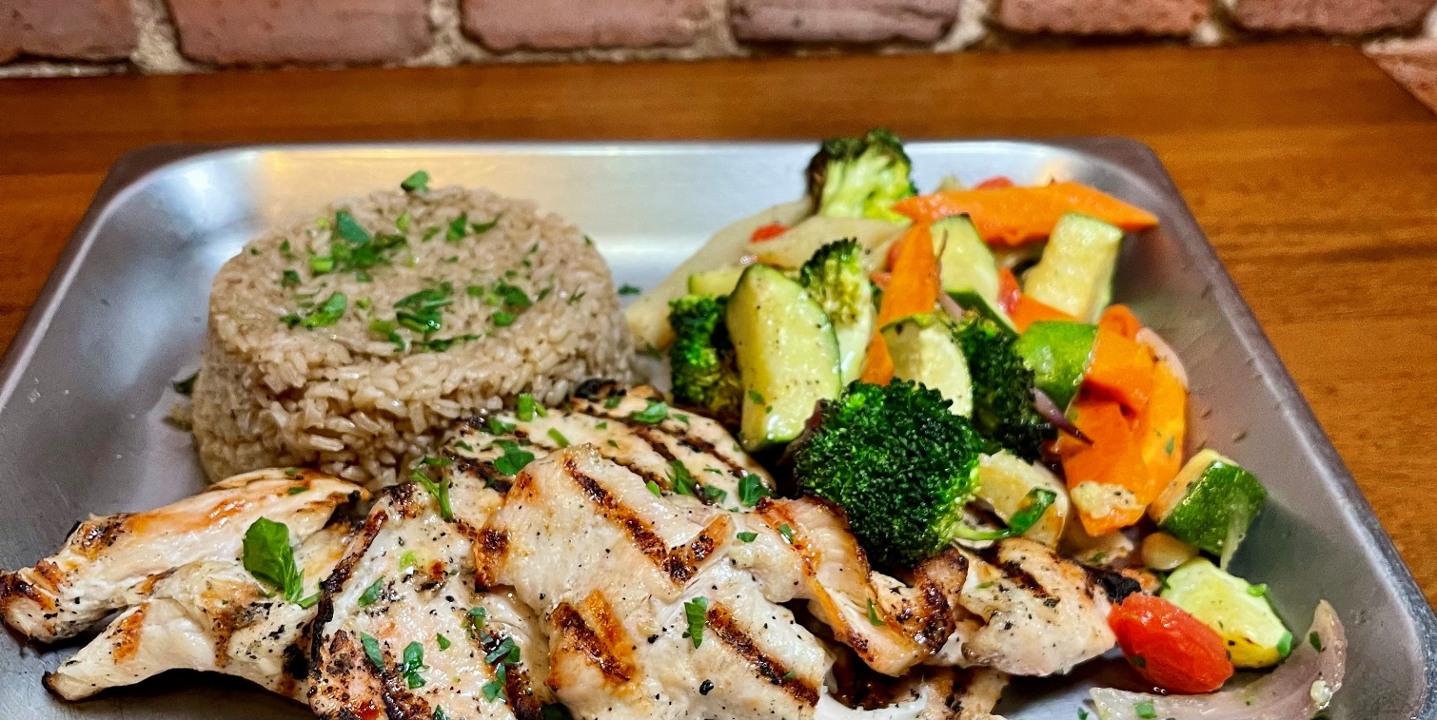 Freshly char-grilled chicken with rice pilaf and market roasted veggies