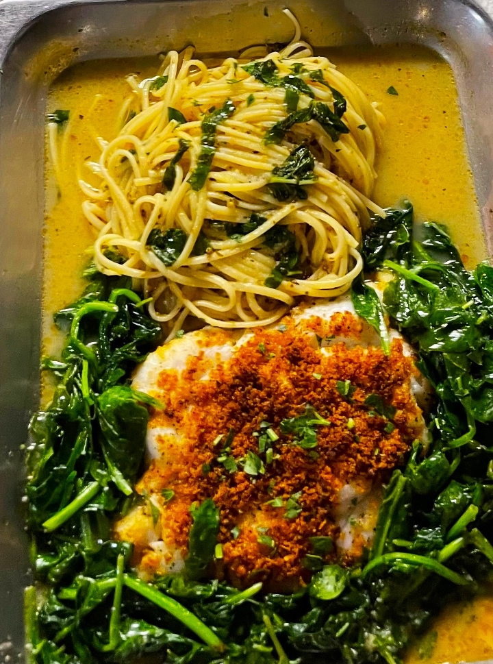 Wild caught Cod fish from Iceland baked with our blend of oreganata bread crumbs in a butter wine sauce with spinach sauteed in garlic and extra virgin olive oil served over imported linguine