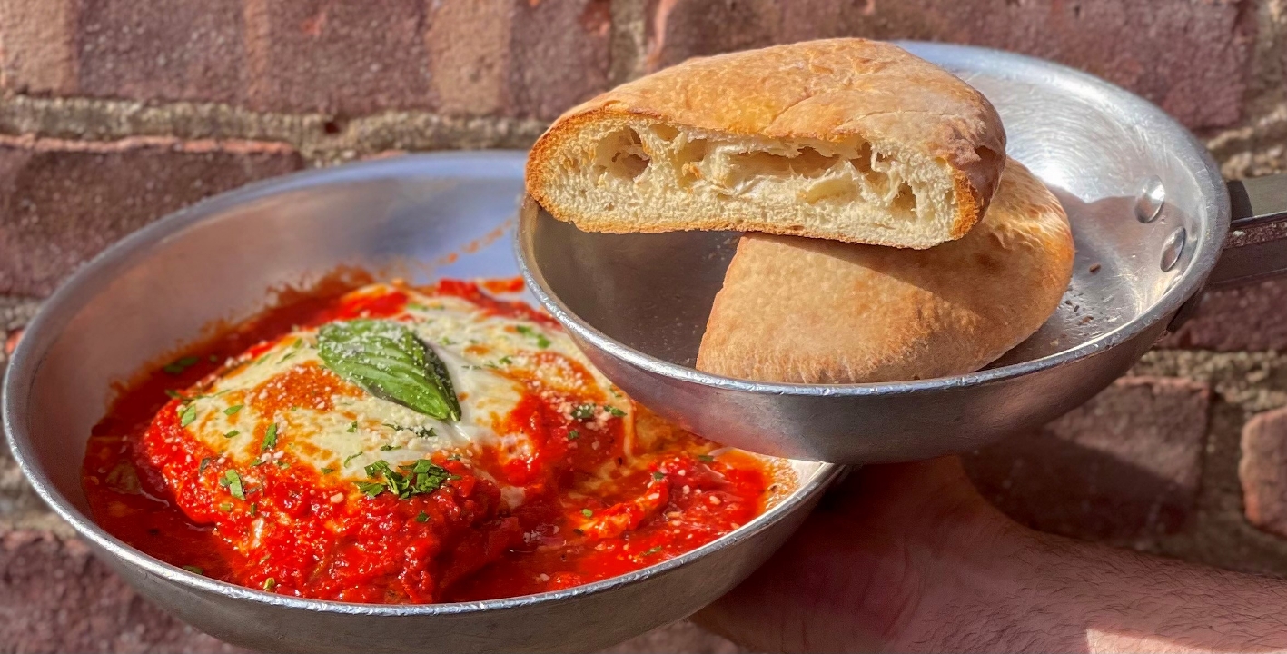 lightly battered eggplant, mozzarella, homemade marinara with our artisan flatbread on the side