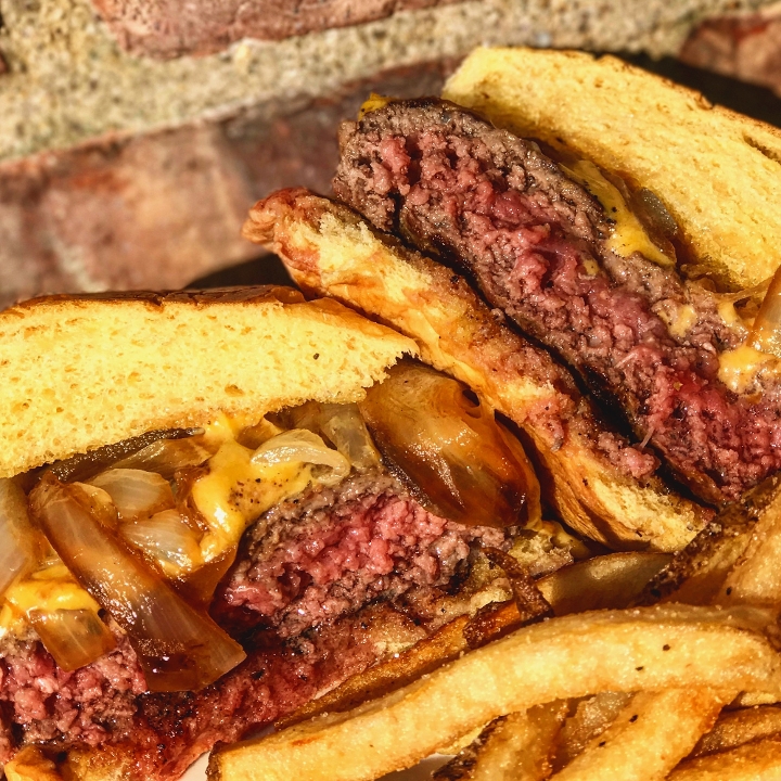 Fresh ground chuck, short rib, brisket & naval topped with American cheese & slow cooked sweet caramelized onions served on a Martin's potato roll