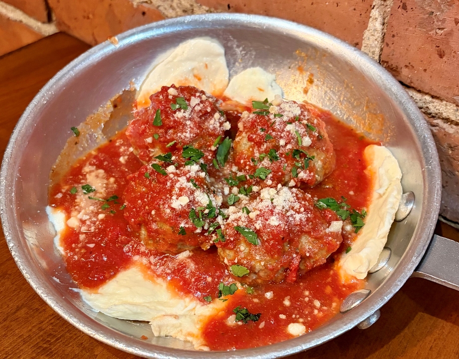 pork, veal, beef, pecorino & romano cheese, herbs, bread & eggs are in our meatballs topped with mozzarella, homemade marinara on artisan bread