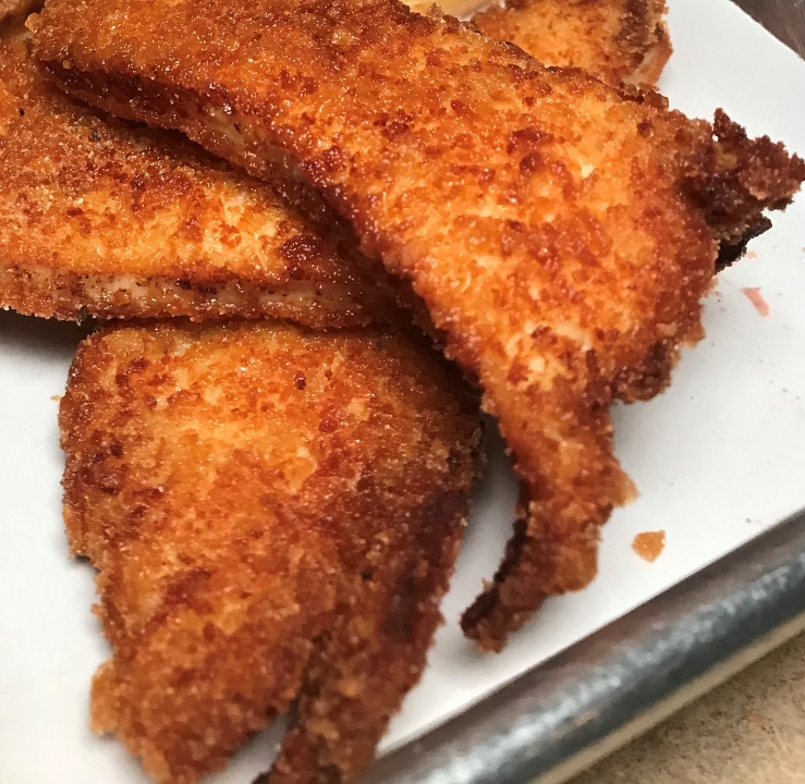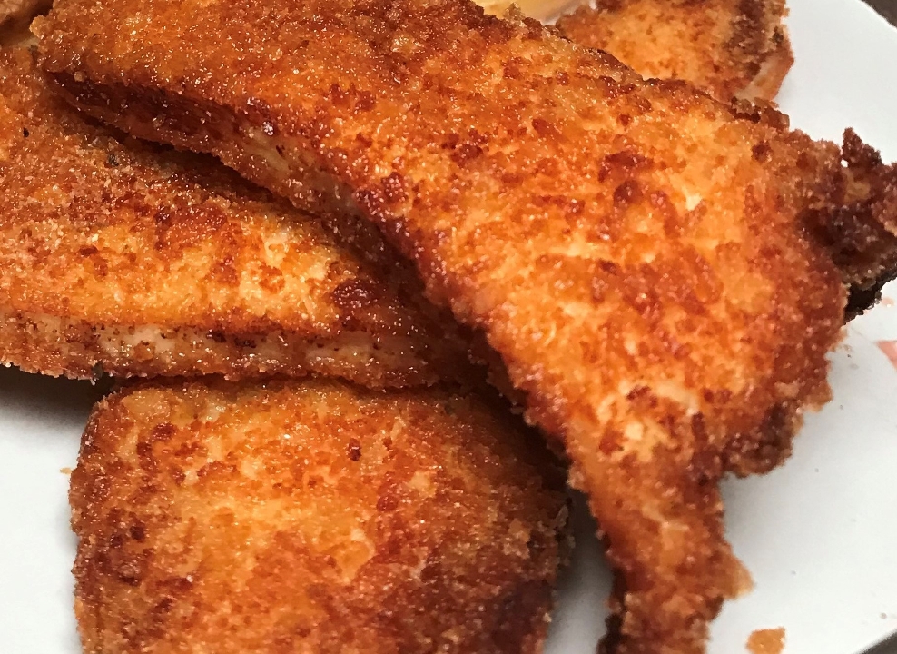Hand trimmed chicken breast breaded with Panko breadcrumbs and cooked to a light delicious crispiness