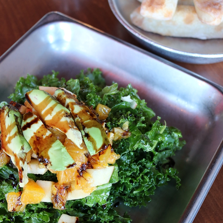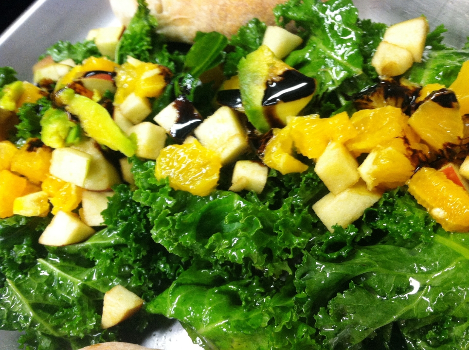 Fresh cut kale topped with apples, sweet oranges and avocado with homemade honey lemon dressing