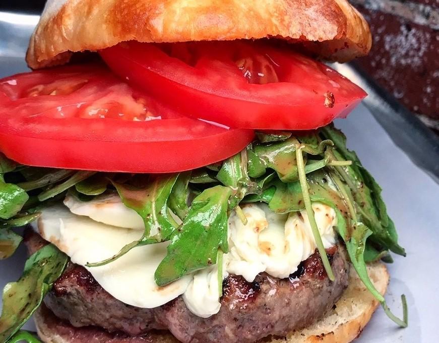 Fresh house-made mozzarella served with ripe tomatoes and arugula on top of our hamburger with seasoning & balsamic dressing on our homemade artisan garlic roll