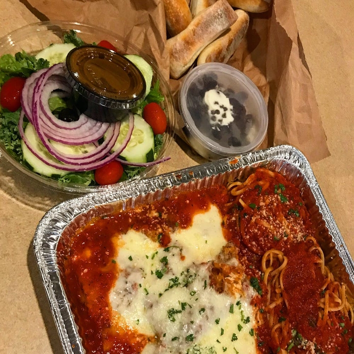 Chicken Parmigiana, Pasta, Salad & Homemade Bread & Brownies