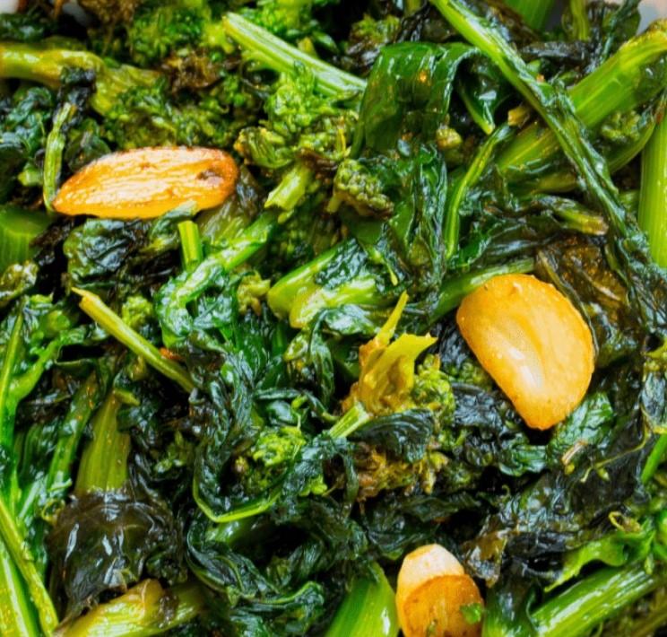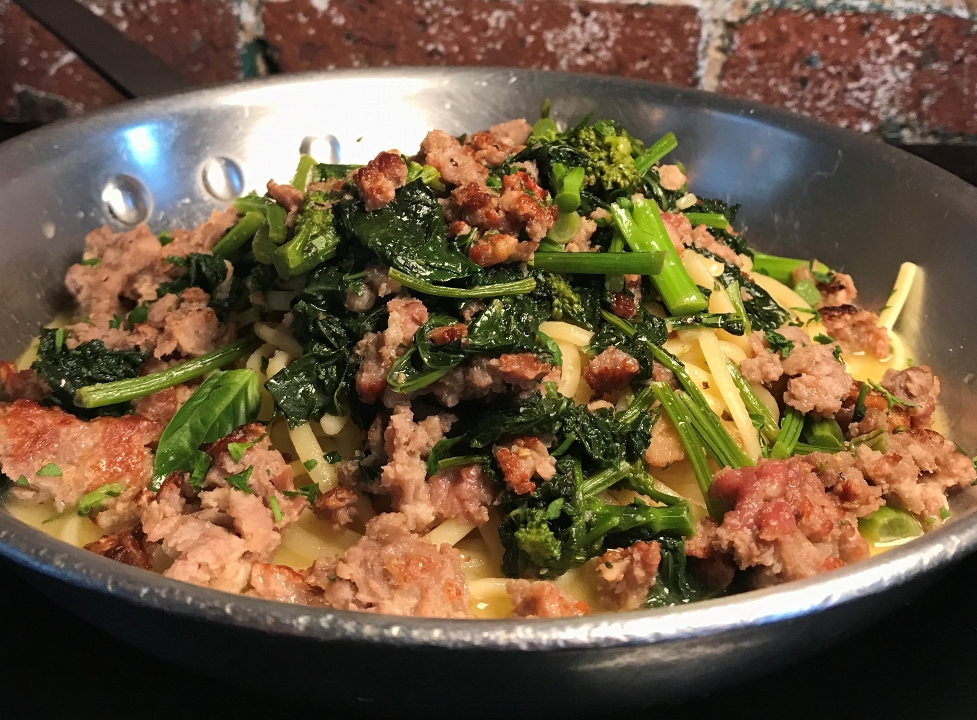 Fresh sausage and broccoli rabe sauteed in garlic & EVOO finished in a garlic butter sauce, over imported linguine
