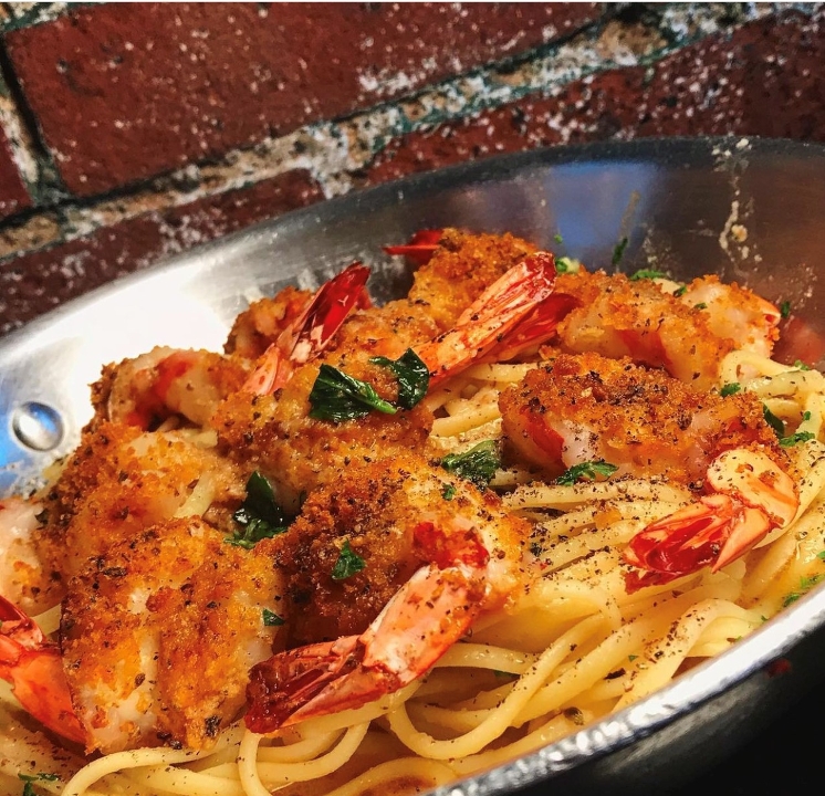 sweet tender shrimp baked with oreganata bread crumbs, EVOO in a garlic butter wine sauce, imported linguine and fresh baked bread