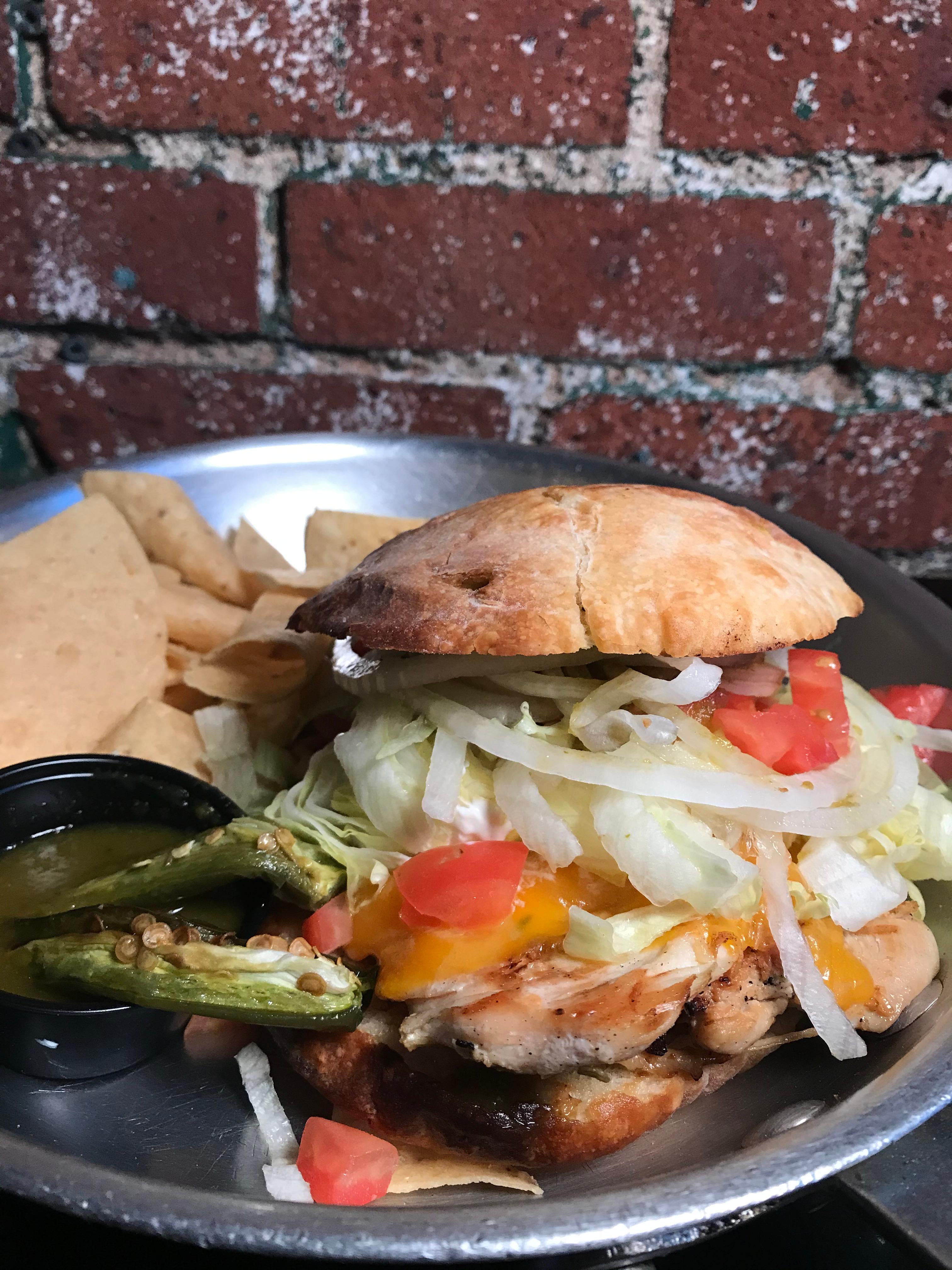 char-grilled chicken and cheddar topped with chopped lettuce, tomato, onion & our spicy 5 pepper sauce with crema on our homemade garlic , EVOO artisan roll