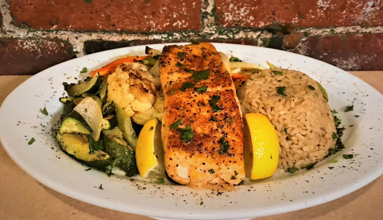 Best Farm Raised Salmon on the planet: garlic seared with market roasted vegetables & brown rice