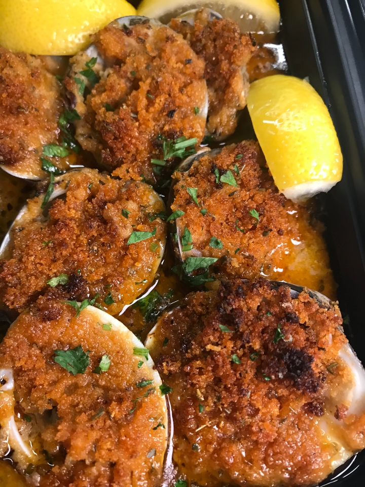Fresh shucked littleneck clams topped with our old school recipe of bread crumb oreganata in a sauce you want to dip the bread in!