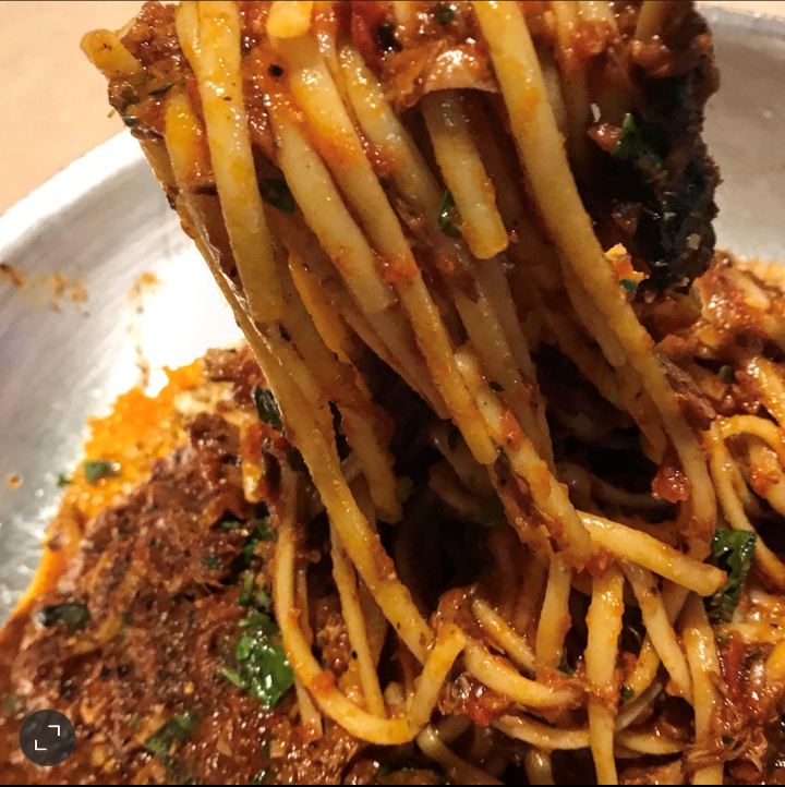 Seared and braised lamb simmered with natural ajus and veggies until we say it is ready....fresh mint, basil over imported linguine