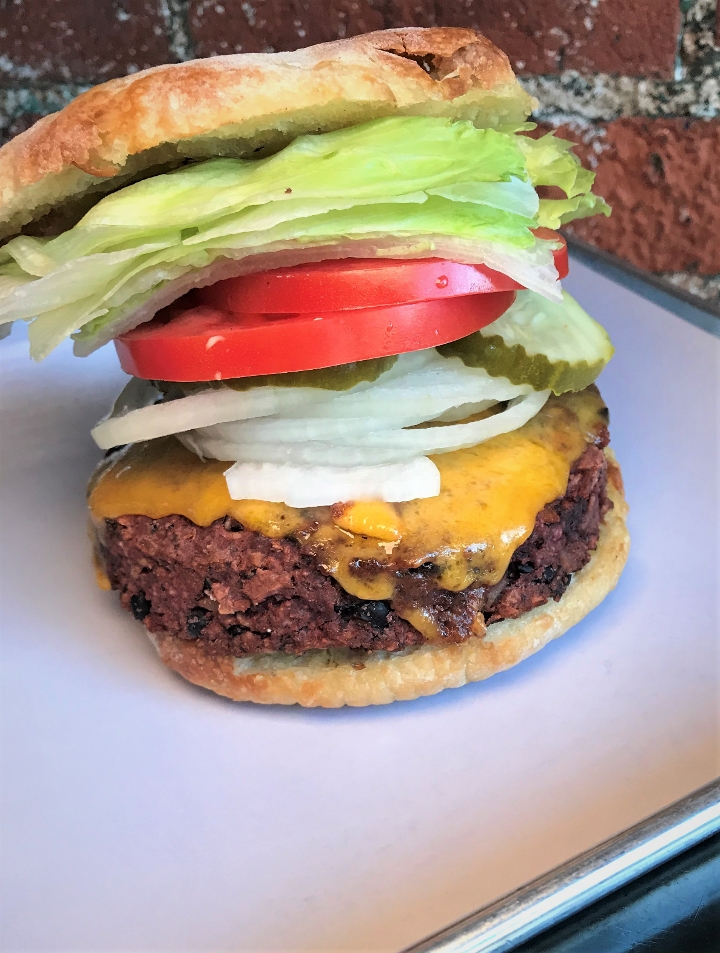 homemade with grains, veggies & herbs, with cheddar, lettuce, tomato, red onion & pickles contains eggs / no meat