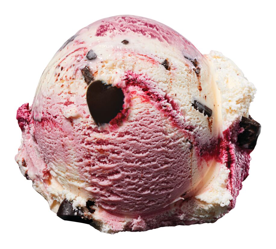 Wintery White Chocolate flavored Ice Cream with a flurry of Chocolate flavored Coated Cherry Pieces & Cherry Swirls.